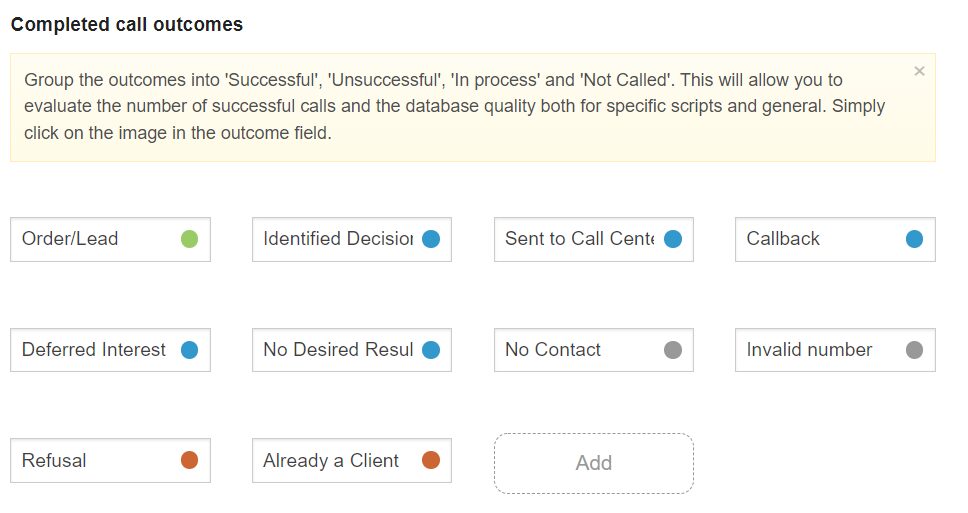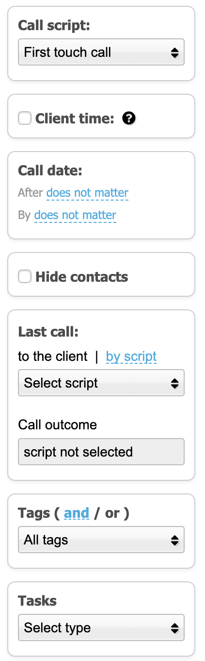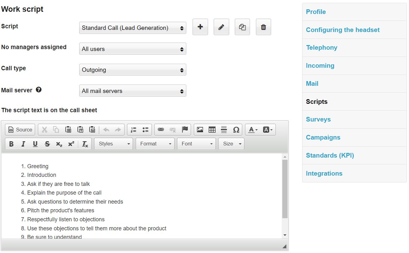 Select the scenario according to which customers will be called in this project. When the call is distributed, the operator will see a client card with the set scenario and the results at the end of the call.