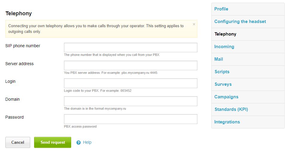 Enter the number that will be displayed to the customer when calling. Each project can have its own number. If the number has not yet been confirmed in the service, then click «Confirm» and enter the code from the incoming call. If your own PBX is connected, set the number of lines indicator value at the rate of 6 lines per operator. When doing this, consider the number of lines supplied by your telephony operator and the number of projects. If you have several projects, distribute the number of lines between them.